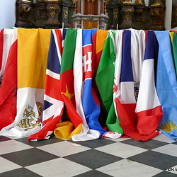 Beim Einzug, begleitet von einer ruandischen Trommlergruppe, tragen viele Mitfeiernde die Fahne ihres Herkunftslandes.